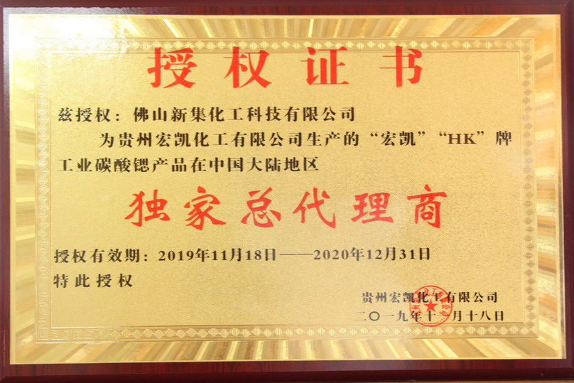 授予佛山市新集化工科技有限公司,為貴州宏凱化工有限公司生產(chǎn)的“宏凱”“HK”牌工業(yè)碳酸鍶產(chǎn)品在中國大陸地區(qū)獨(dú)家總代理。